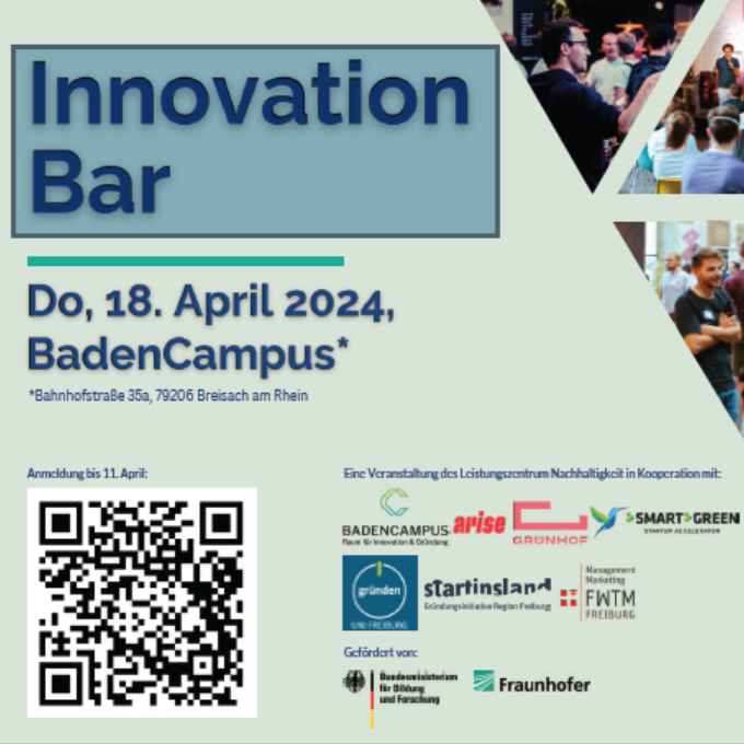 Wir freuen uns zu verkünden, dass auch in diesem Jahr wieder die Innovation Bar stattfinden wird. Die Veranstaltung, die das Leistungszentrum Nachhaltigkeit in Zusammenarbeit mit Grünhof, Baden Campus, Gründungsbüro der Uni Freiburg, Smart Green Accelerator und Startinsland organisiert, richtet sich v.a. an Nachwuchswissenschaftler:innen, Gründungsinteressierte und diejenigen, die bereits auf dem Weg zur Gründung sind und informiert über Förder- und Beratungsangebote.